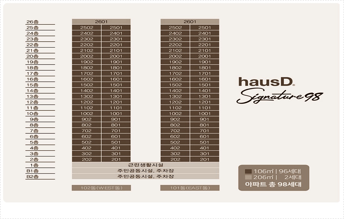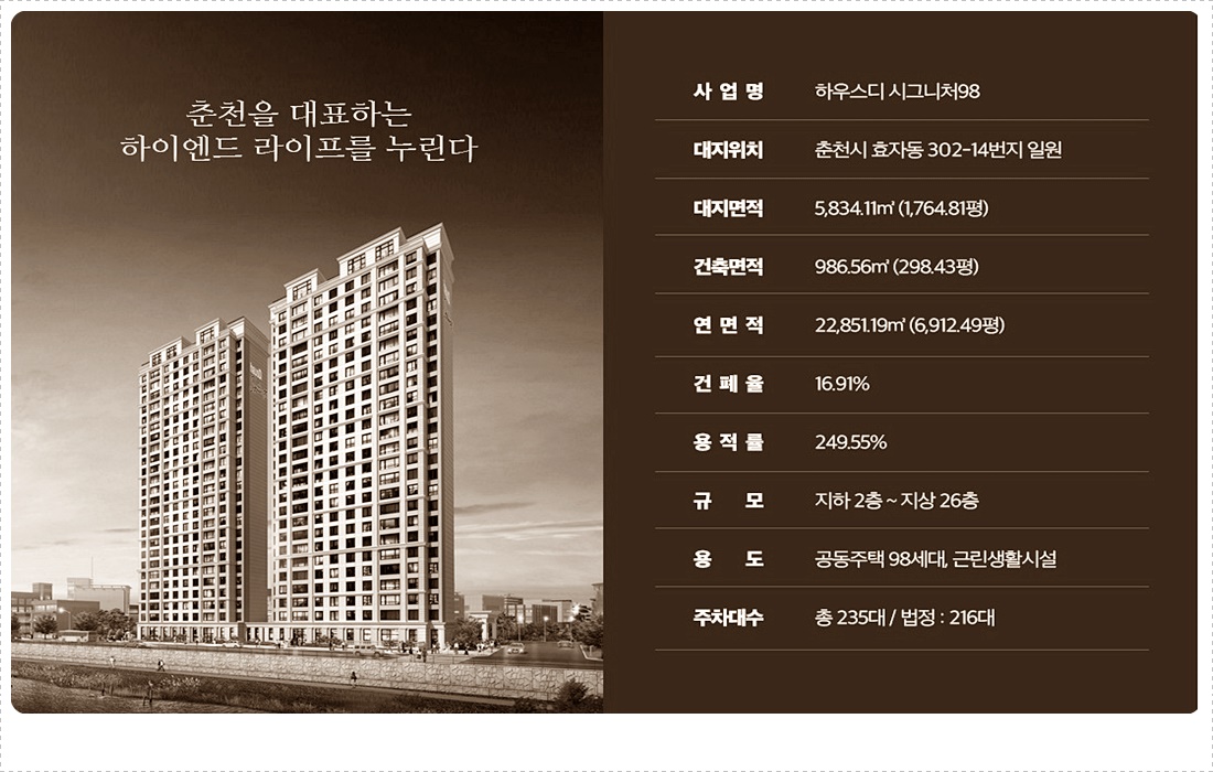 춘천 하우스디 시그니처 98 춘천시는 역세권(驛勢圈) 개발(開發)을 비롯하여 물의 도시(都市) 봄내 구성사업(構成事業), 교육(敎育) 도시(都市), GTX B 노선(路線) 연장(延長) 등(等) 대범위(臺範圍) 호재(好材)를 통(通)한 인구유입(人口流入)이 기대(期待)되는 지역(地域)입니다. 이 곳에 자리잡을 춘천 하우스디 시그니처 98은 입지(立地)와 인프라까지 하이엔드 A.P.T로 성장(成長)할 가능성(可能性)을 가진 상품(商品)입니다.?본 프로젝트는 춘천시에 자리한 효자동(孝子洞) 302-14번지(番地) 일원(一圓)에 들어섭니다. 22,851.19제곱미터의 연면적(延面積)과 249.55퍼센트의 용적률(容積率)로 구성(構成)되며 지하(地下) 2층(層)에서 지상(地上) 26층(層)의 두 개(個) 동(洞)에 총(總) 98세대(世代)가 마련된다고 합니다는 소식(消息)을 알려왔습니다.?주차장은 법정(法廷) 주차대수인(駐車臺數人) 216대(代)보다 여지(餘地)로운 총(總) 235대(臺)가 공급(供給)될 계획(計劃)이며 전용면적(專用面積)은 106제곱미터와 206제곱미터 2가지 type으로 구성(構成)됩니다. 그리고 남향(南向)으로 설계(設計)되어 넉넉한 채광(採光)과 일조량(日照量)을 느낄 수 있으며 동(桐) 배치(配置)가 일자(日子)로 되어 조/망(網)/권(卷)과 사일상(社日常) 터득(攄得)에 유리합니다.?